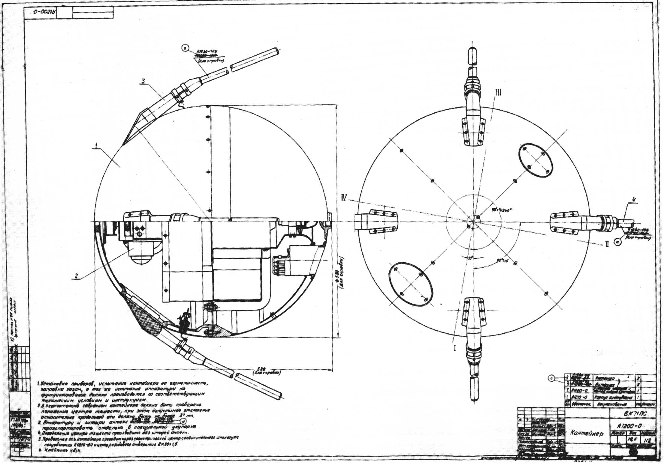 1 interruttore del controllo termico 2 trasmettitore radio (3,5 kg) 3 commutatori di temperatura e pressione 4 ingresso saldato cavo 5 antenna (4,2 kg) 6 batterie elettro-chimiche 7 ingresso dell'interfaccia 8 ingresso del sensore 9 ventilatore (0,2 kg) 10 diffusore (1,2 kg) 11 tele-commutatore (1,6 kg) 12 "guscio" in lega traslucida (1,6 kg) |